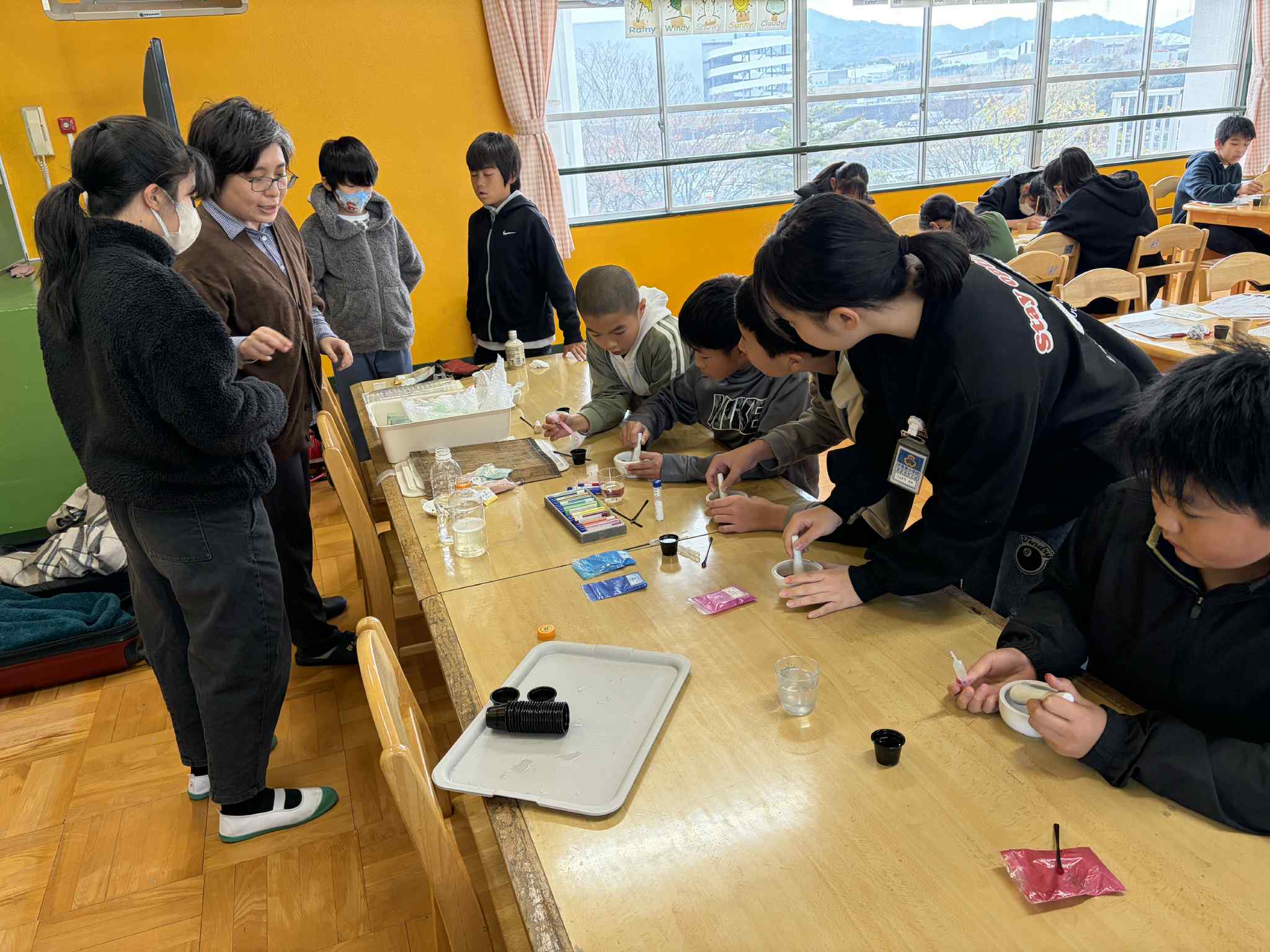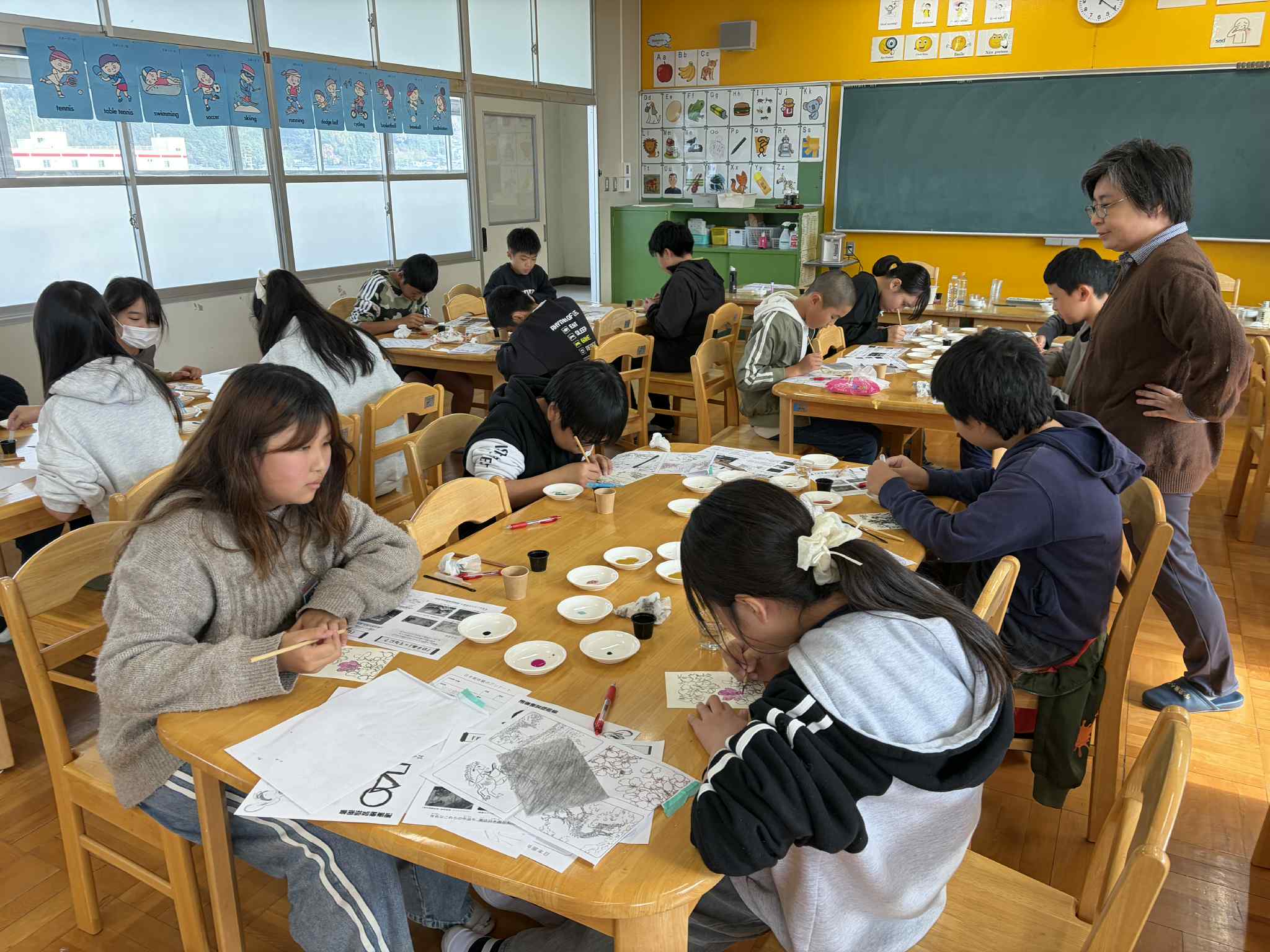 糟屋郡、宇美町小学校の6年生に日本画の体験をしていただきました。 生徒さんに一生残る体験を経験していただこうという先生方の意向で開催が実現し、先生方も生徒の皆さんも一緒に一生懸命に取り組んでいました。